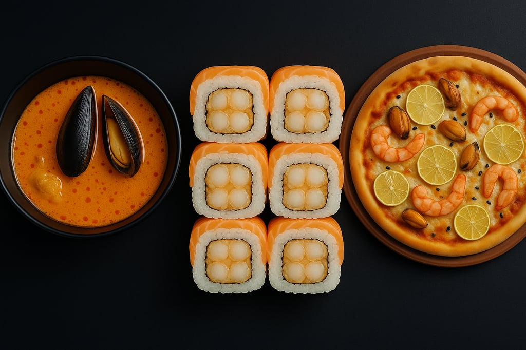 Рис, лосось, креветка, тунець.